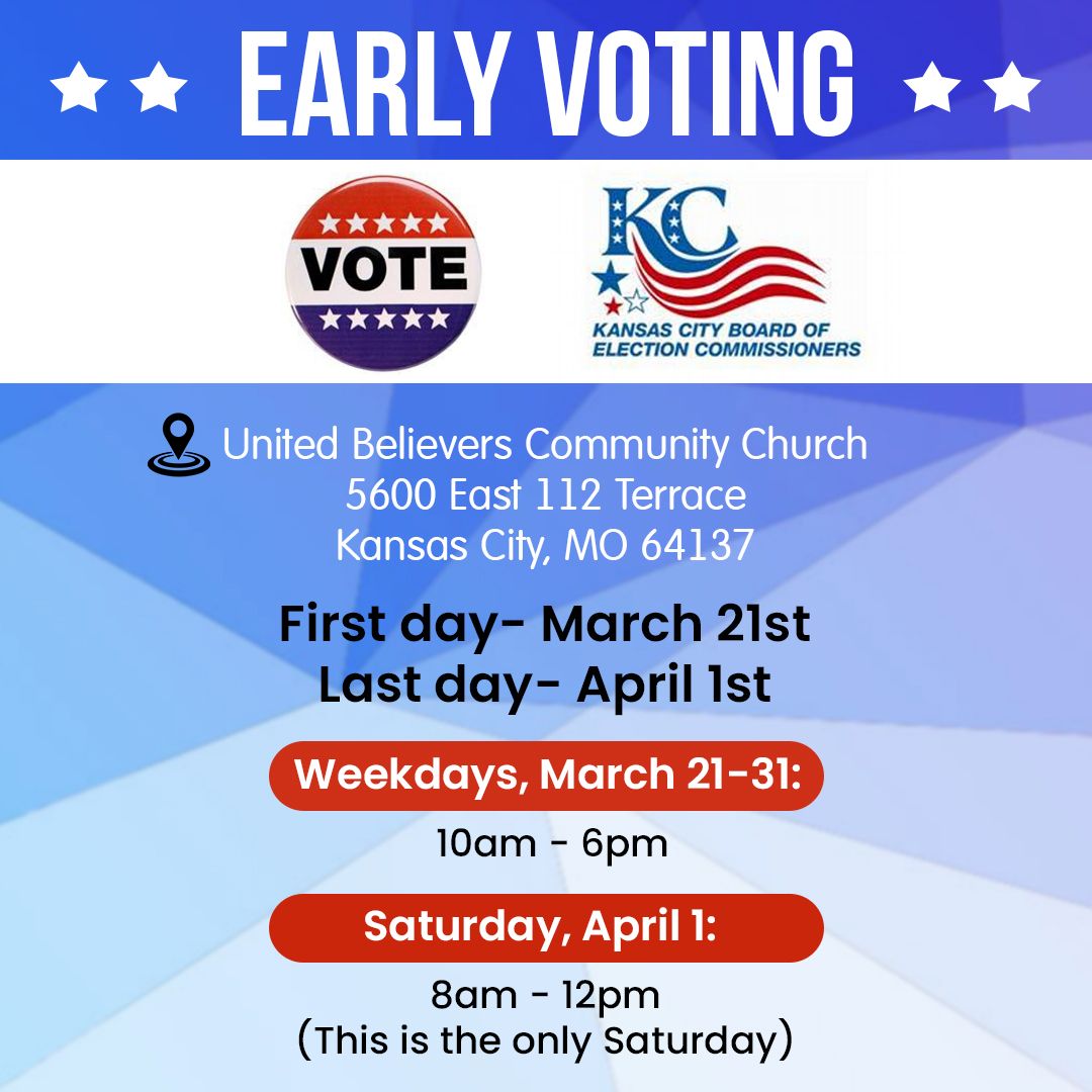 Registered voters may vote early at United Believers Community Church, weekdays from 10 am to